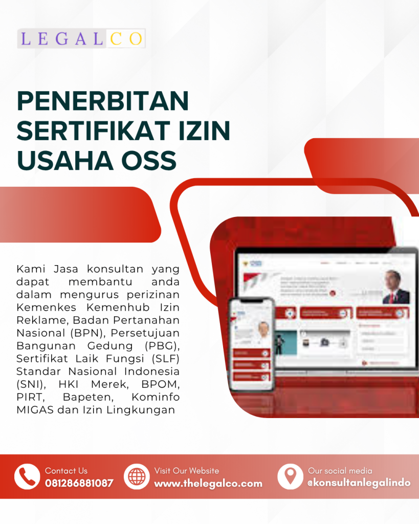 Kami juga siap membantu anda dalam mengurus Perizinan HKI Merek, Halal MUI, BPOM, Badan Pertanahan Nasional, Izin Reklame, Persetujuan Bangunan Gedung (PBG), Sertifikat Laik Fungsi (SLF), Kemenhub, Kemenkes, PIRT, Bapeten, Kominfo, Migas dan Izin Lingkungan